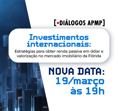 A 4ª edição do Diálogos APMP foi adiado e será realizado no dia 19 de março, às 19h. Com o tema "Investimentos internacionais: Estratégias para obter Renda Passiva em dólar e Valorização no Mercado Imobiliário da Flórida", o evento contará com uma palestra do advogado Bruno Lofhagen, que será mediada pelo Diretor de Defesa de Prerrogativas, Cláudio Franco Félix.