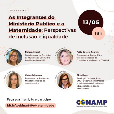 No dia 13 de maio, às 18h, ocorrerá o webinar “As Integrantes do Ministério Público e a Maternidade: Perspectivas de inclusão e igualdade”, promovido pela comissão de mulheres da CONAMP. O evento será on-line e sem necessidade de inscrição prévia.