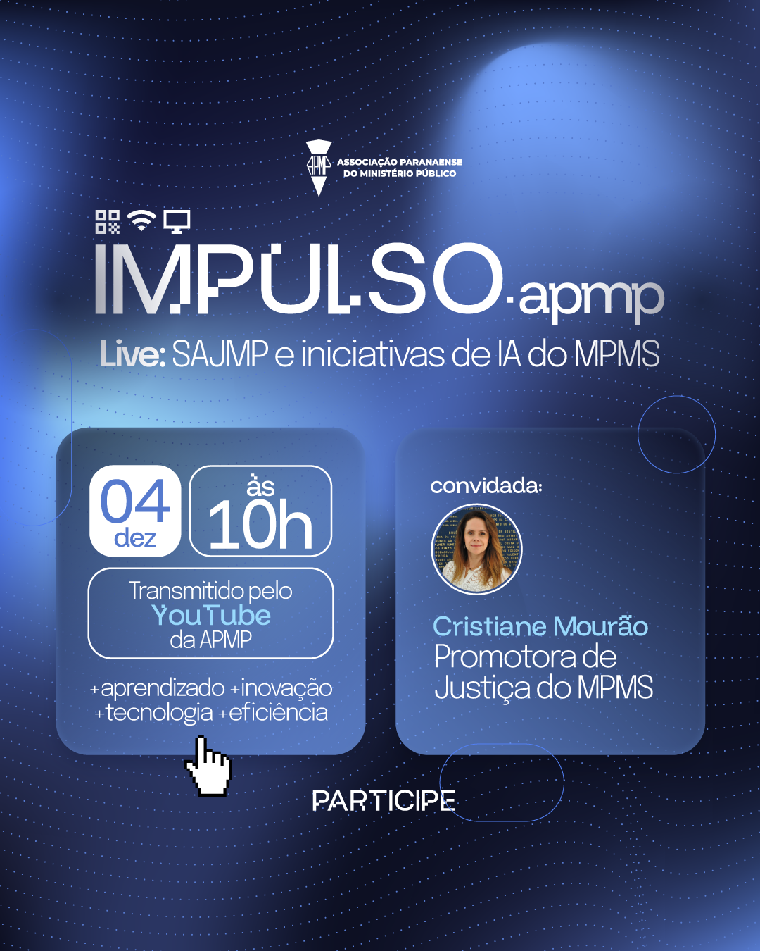 A APMP realiza, nesta quinta-feira (4), às 10h, mais uma edição do Projeto Impulso, ciclo de encontros dedicado à inovação e tecnologia aplicada à atuação ministerial.
