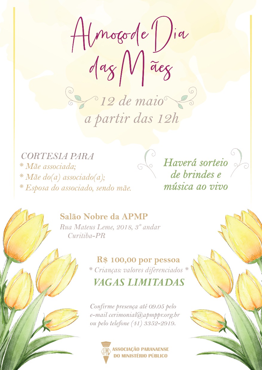 A APMP promoverá o tradicional Almoço de Dia das Mães, no dia 12 de maio, a partir das 12h. A confraternização ocorrerá no Salão Nobre da sede administrativa da Associação, em Curitiba.