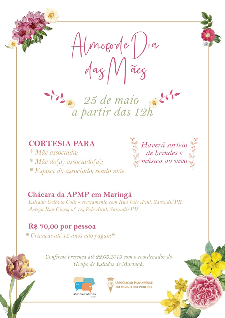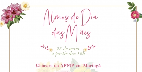 A APMP, por meio do Grupo de Estudos Rogério Luz, de Maringá, promove no dia 25 de maio o Almoço de Dia das Mães. O evento celebrativo ocorrerá na chácara da Associação, em Sarandi/PR, a partir das 12h.