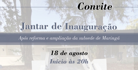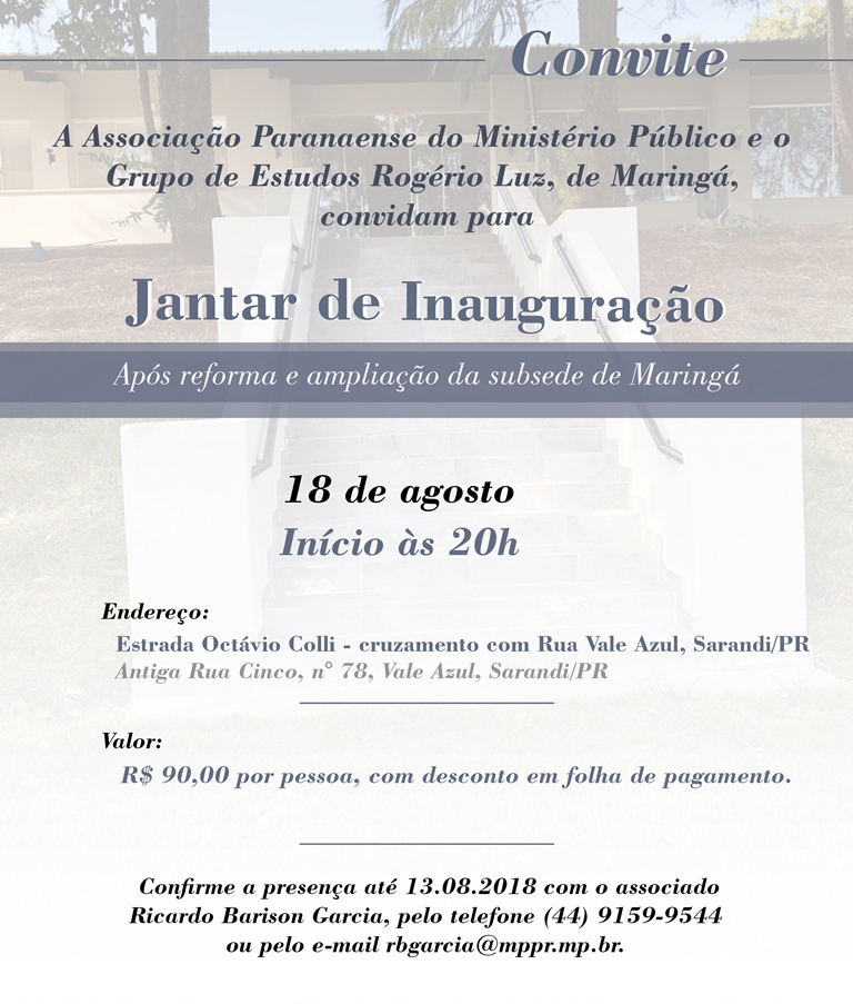 A APMP e o Grupo de Estudos Rogério Luz, de Maringá, convidam os associados e seus familiares para o Jantar de Inauguração da subsede de Maringá. O encontro apresentará as novas instalações da subsede de Maringá, após reforma e ampliação. O evento ocorrerá no dia 18 de agosto, a partir das 20h, já na nova estrutura.