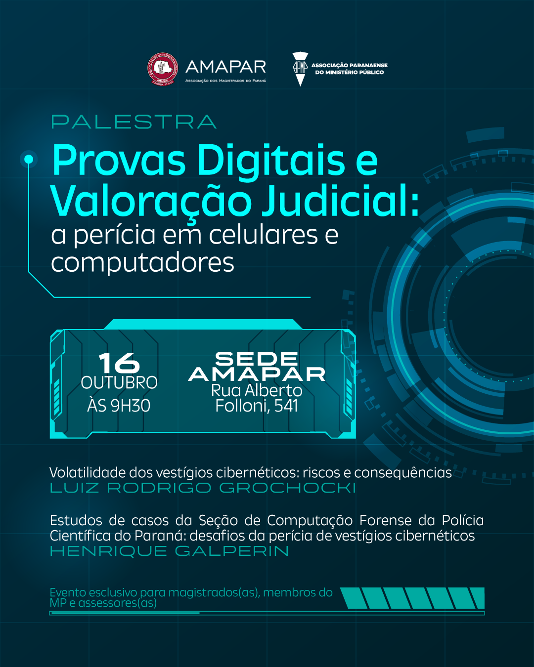 A Associação Paranaense do Ministério Público (APMP) e a Associação dos Magistrados do Paraná (AMAPAR) convidam associados(as), magistrados(as) e assessores(as), para a palestra “Provas Digitais e Valoração Judicial: a perícia em celulares e computadores”, que será realizada no dia 16 de outubro, a partir das 9h30, na sede da AMAPAR (Rua Alberto Folloni, n.º 541, Curitiba).