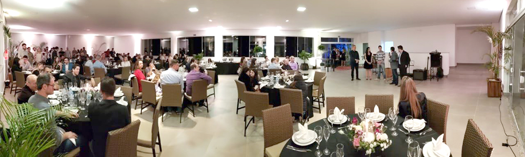 Durante o jantar, os presentes puderam desfrutar da mesa de antepastos, com sete opções de frios, e do serviço volante com brandade de bacalhau. O cardápio foi preparado pelo Buffet “Mister Chef”. O menu principal, com sete pratos quentes, entre eles filet ao molho roti, legumes a mediterrânea e roll de frango ao molho branco e crítico de maracujá, agradou todos os paladares. Como sobremesa, foi servido gelado de leite condensado, caramelizado com farofa de chocolate e castanhas. Para refrescar, foram servidas várias opções de bebidas: água com e sem gás, refrigerantes normal e zero, suco, cerveja, espumante, vinho e whisky Black Label.
