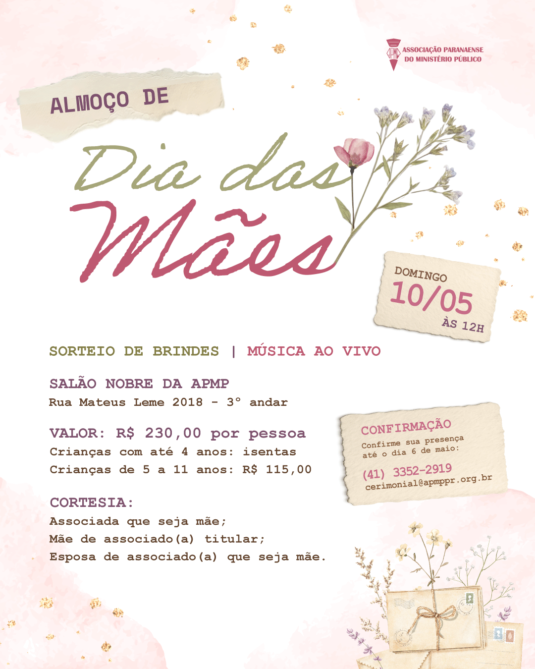 A APMP orienta os interessados a entrarem em contato com o setor de eventos para garantir participação. Trata-se de uma oportunidade de reunir a família e celebrar o Dia das Mães em um ambiente cuidadosamente preparado para promover convivência e valorização dessa data.