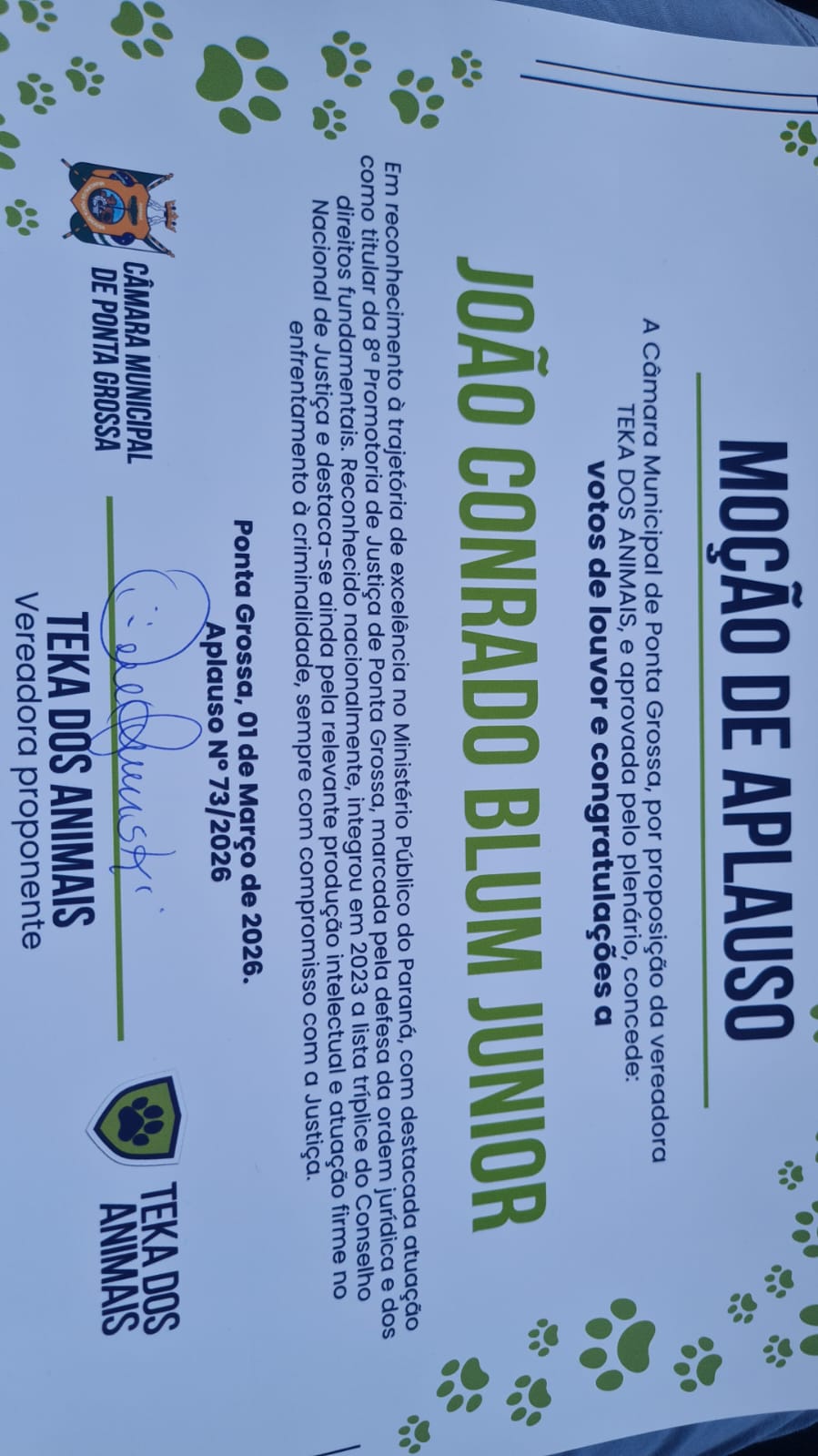 A honraria concede votos de louvor e congratulações em reconhecimento à trajetória do associado no Ministério Público do Paraná, especialmente por sua destacada atuação como titular da 8ª Promotoria de Justiça de Ponta Grossa, marcada pela defesa da ordem jurídica e dos direitos fundamentais.