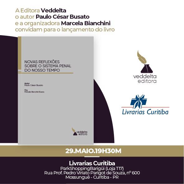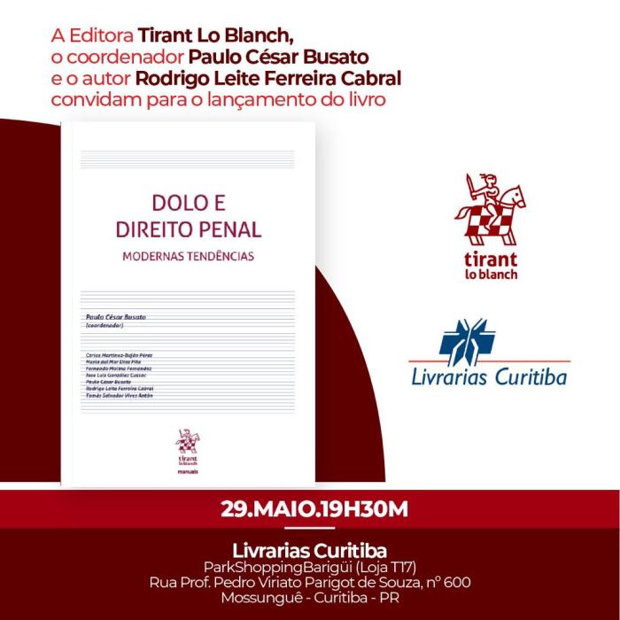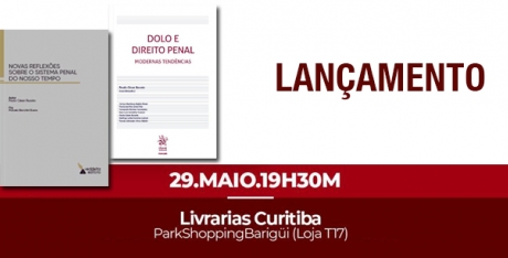 No dia 29 de maio de 2019, às 19h30min, ocorrerá o lançamento dos livros “Dolo e Direito Penal - Modernas Tendências” e “Novas Reflexões Sobre o Sistema Penal do Nosso Tempo”, na Livrarias Curitiba do ParkShoppingBarigüi, em Curitiba.