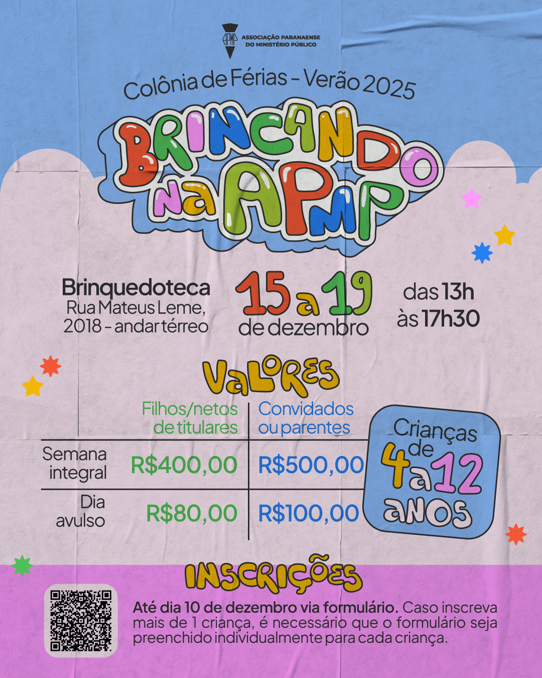 A Associação Paranaense do Ministério Público (APMP) promove, entre os dias 15 e 19 de dezembro, a edição de verão do Brincando na APMP, iniciativa dedicada exclusivamente a crianças de 4 a 12 anos. As atividades serão realizadas da sede administrativa da Associação, das 13h às 17h30, com ponto de encontro na Brinquedoteca
