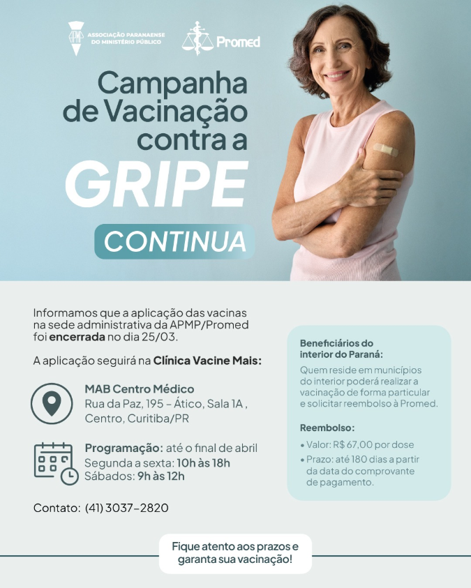 A Promed/APMP informa que a aplicação das vacinas contra a gripe na sede administrativa, em Curitiba, foi encerrada no dia 25 de março. A campanha, no entanto, segue em andamento na Clínica Vacine Mais, localizada no MAB Centro Médico, na Rua da Paz, 195, Sala 1A, no Centro de Curitiba.