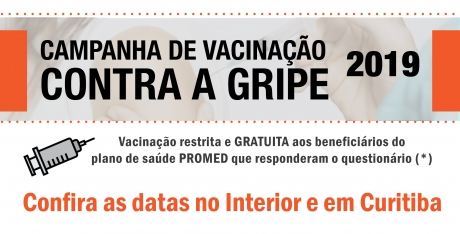 Neste ano, a Campanha de Vacinação Contra a Gripe terá início no dia 09 de abril de 2019. Terão direito à vacina todos os beneficiários do plano de saúde PROMED que responderam à pesquisa, divulgada no período de 18 de fevereiro a 07 de março de 2019. Essas vacinas serão inteiramente subsidiadas pelo PROMED.