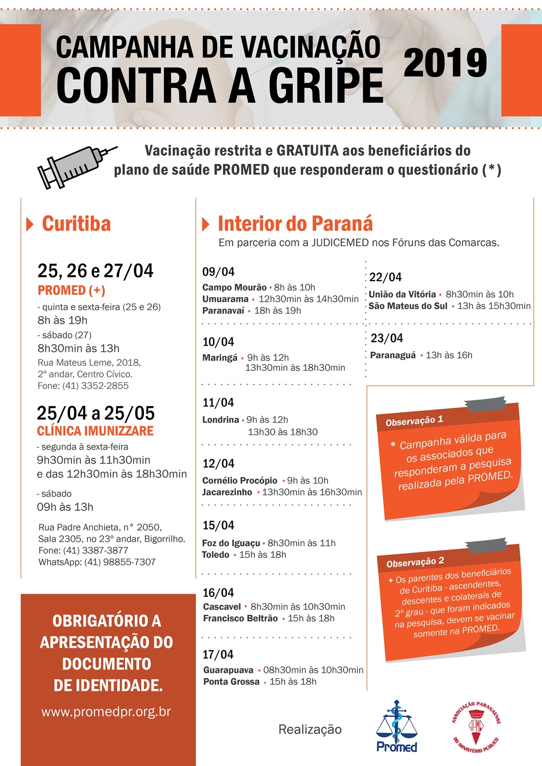 Na capital, as imunizações ocorrem de 25 de abril a 25 de maio. Nos dias 25 e 26 abril de 2019, no horário das 08h às 19h, e 27 (sábado) do mesmo mês e ano, das 8h30min às 13h, as vacinas serão aplicadas na sede do PROMED, localizada na Rua Mateus Leme, 2018, 2º andar, em Curitiba (telefone 41 3352-2855), exclusivamente para os beneficiários do PROMED e associados da APMP (*).