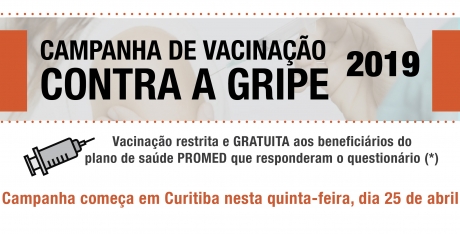 A Campanha de Vacinação contra a gripe da PROMED/APMP em Curitiba começa nesta quinta-feira, dia 25 de abril, a partir das 08h, na sede da PROMED, localizada na Rua Mateus Leme, 2018, 2º andar, em Curitiba.