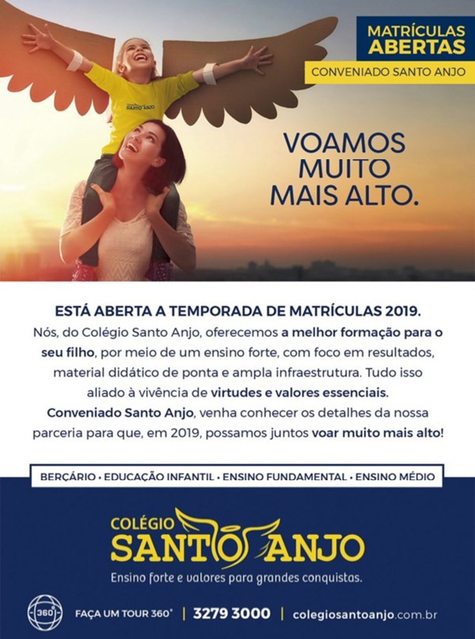 O Colégio Santo Anjo, empresa conveniada da APMP, está com matrículas abertas para o ano letivo de 2019. A instituição oferece ensinos para Berçário, Educação Infantil, Ensino Fundamental, e Ensino Médio.