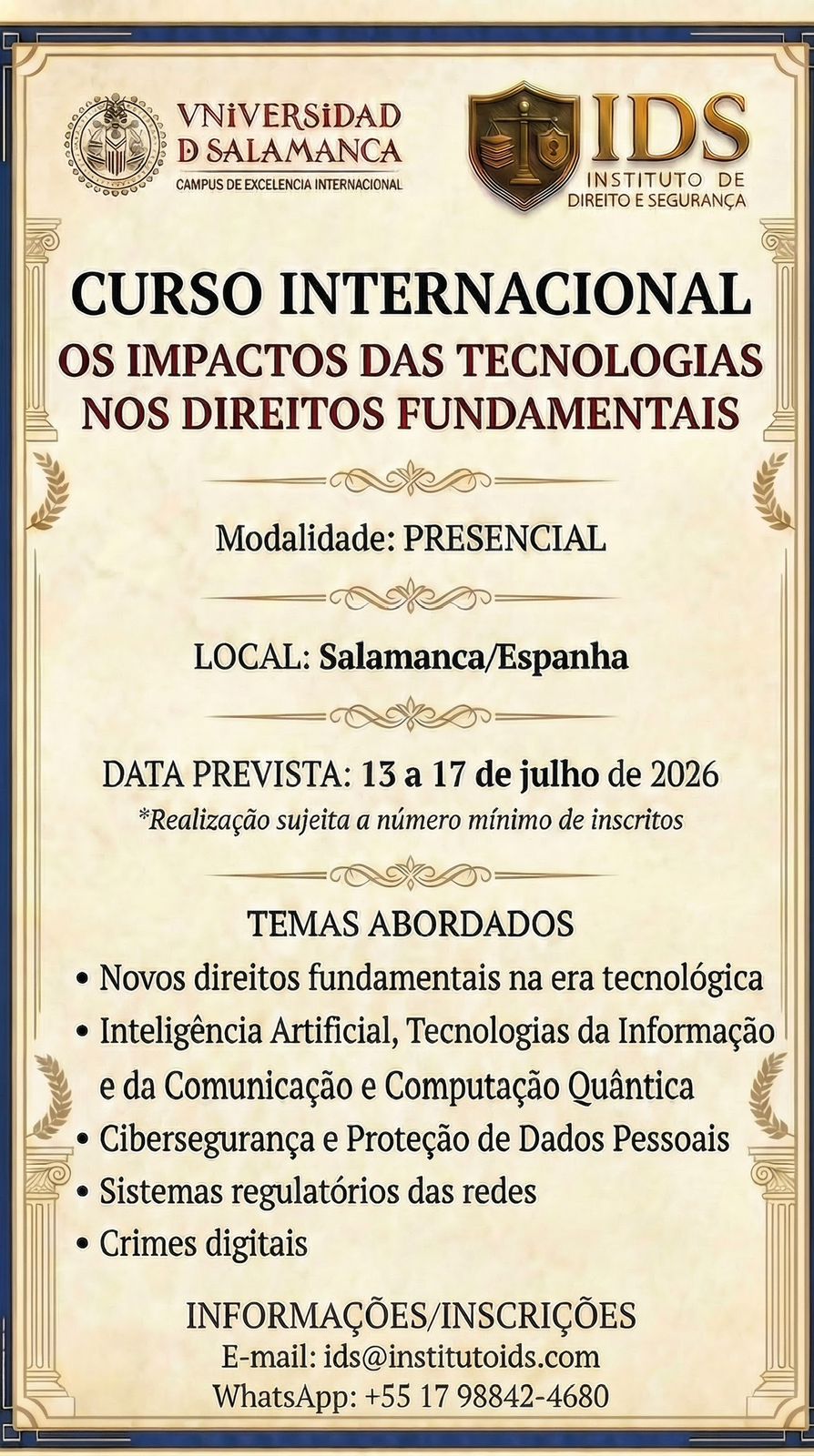 Estão abertas as inscrições para o Curso Internacional: Impactos das Tecnologias nos Direitos Fundamentais, que será realizado de 13 a 17 de julho de 2026, na Faculdade de Direito da Universidade de Salamanca, na Espanha. A iniciativa é promovida pelo Instituto de Direito e Segurança (IDS), em parceria com o Departamento de Direito Constitucional da instituição.