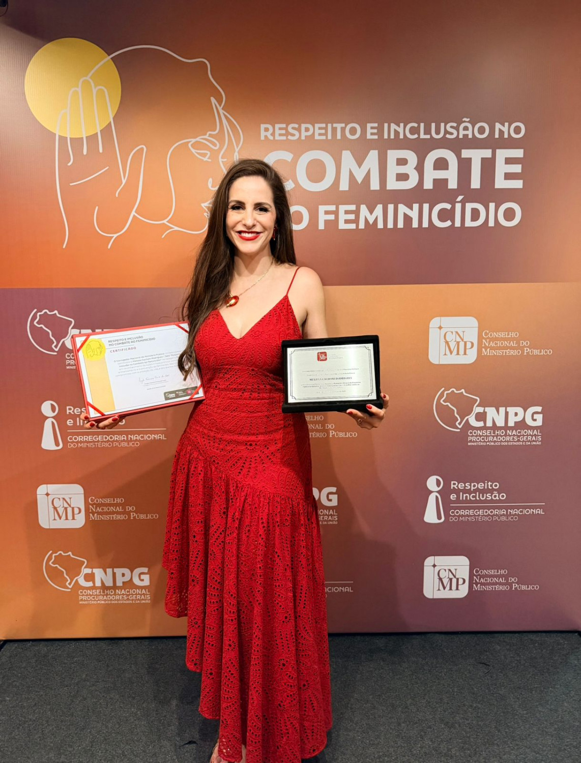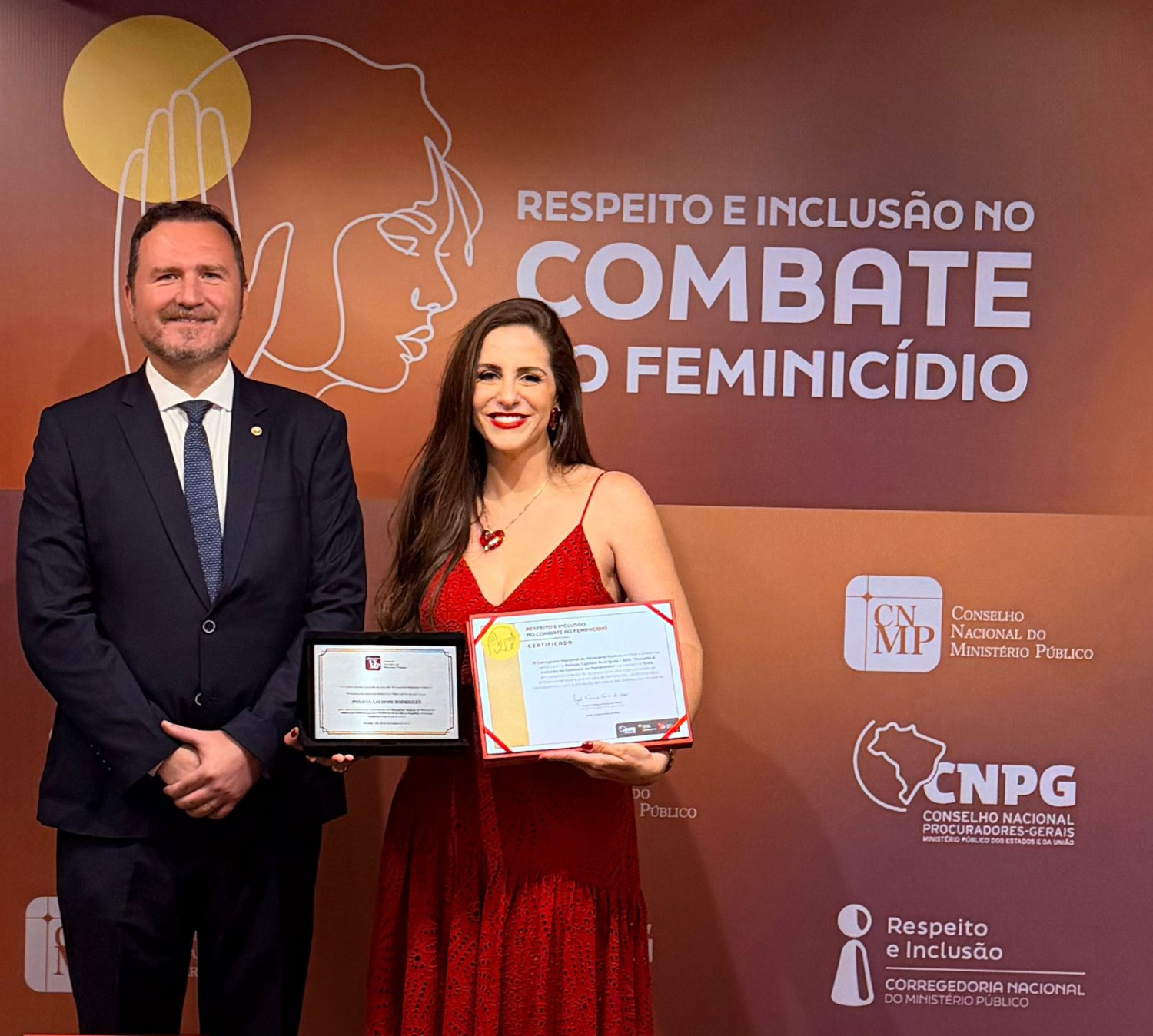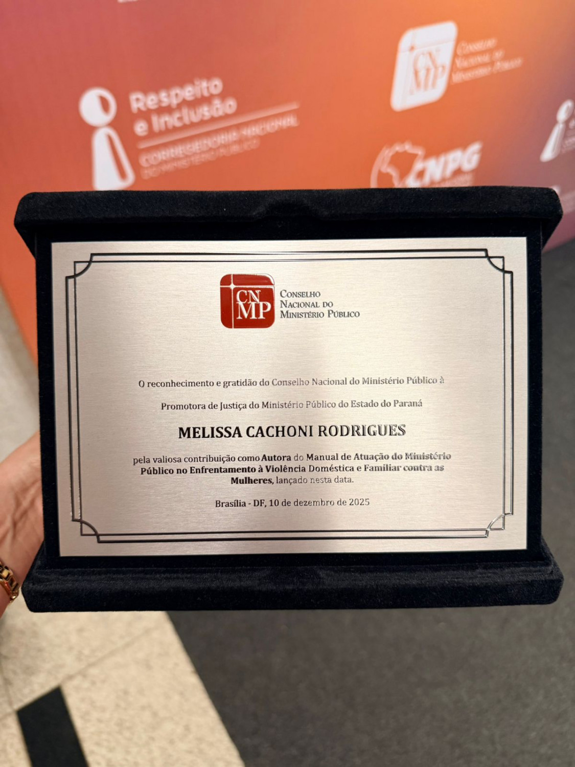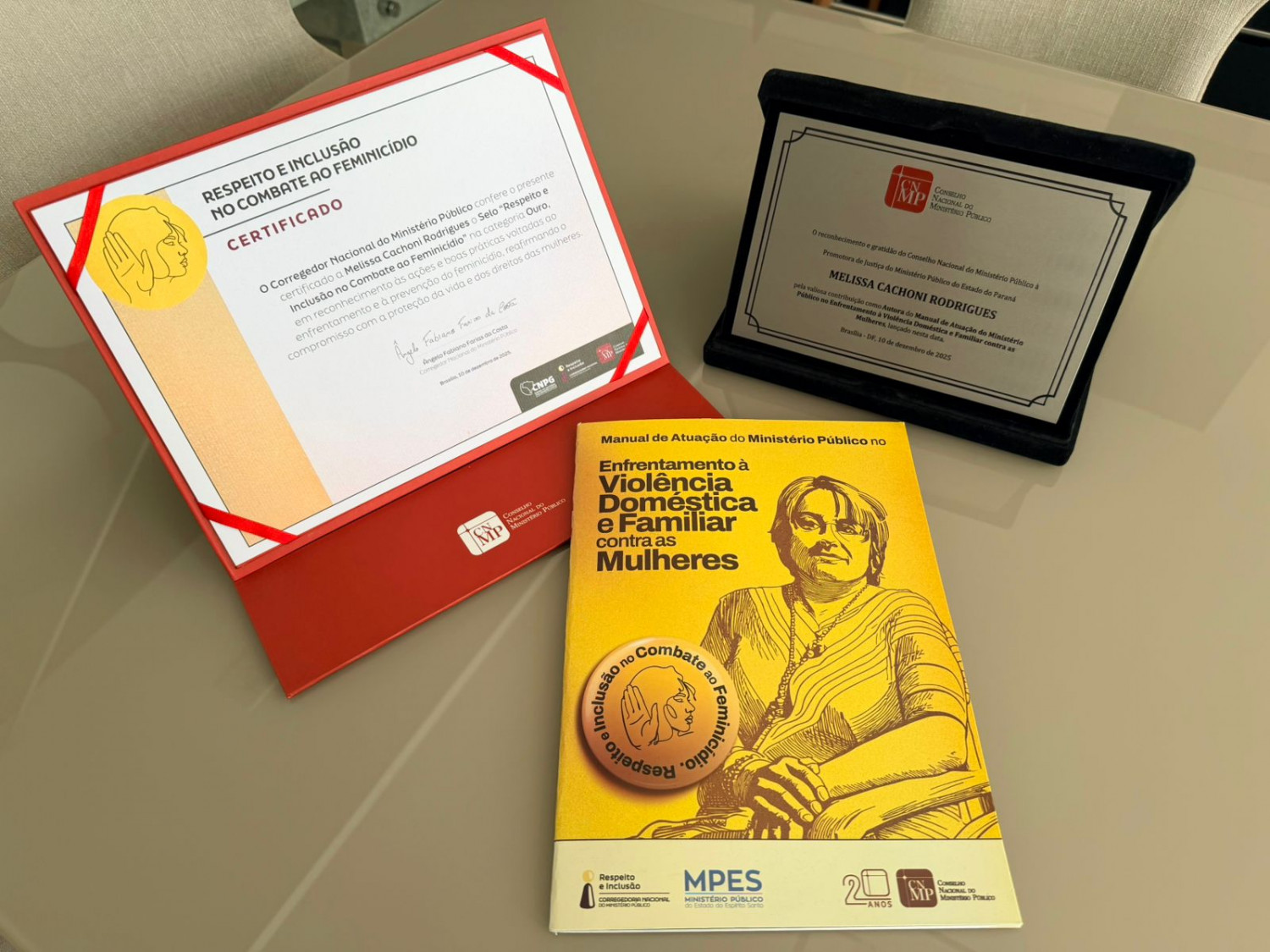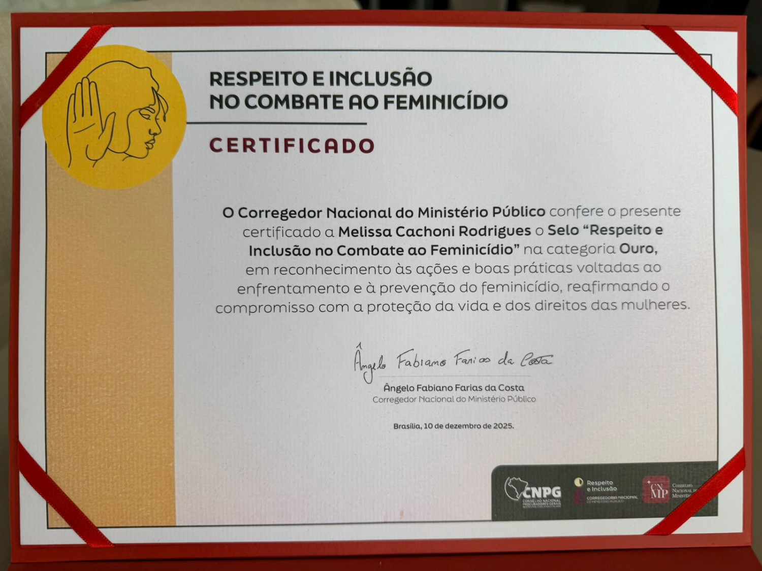 Além da homenagem coletiva, Melissa Cachoni Rodrigues também foi agraciada com um certificado individual, entregue pelo Corregedor Nacional do MP, Ângelo Fabiano Farias da Costa, em reconhecimento à colaboração nas iniciativas de prevenção ao feminicídio encampadas pela Corregedoria Nacional.