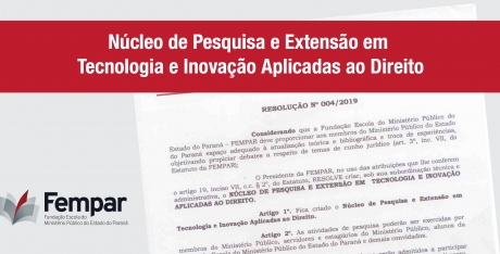 No dia 17 de abril, a Fundação Escola do Ministério Público do Estado do Paraná (Fempar), por meio de seu presidente, o associado Mauricio Kalache, procurador de Justiça, criou, sob sua subordinação técnica e administrativa, o Núcleo de Pesquisa e Extensão em Tecnologia e Inovação Aplicadas ao Direito, veja aqui a Resolução 004/2019.