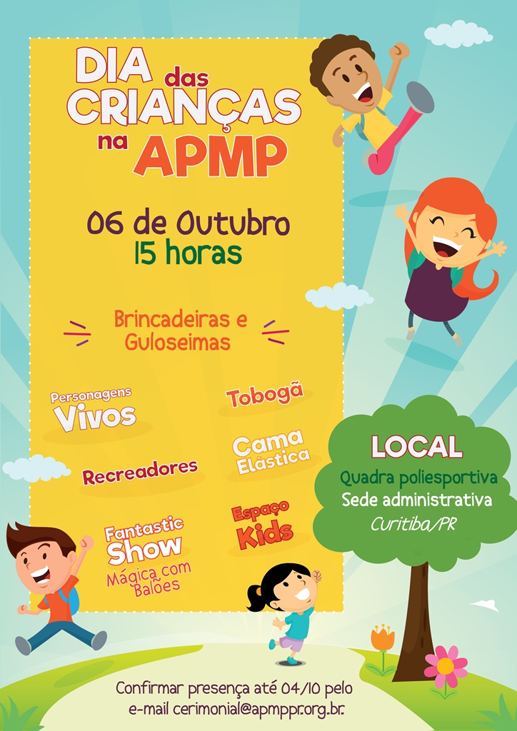 A tradicional Festa de Dia das Crianças da APMP está chegando. O evento ocorrerá no dia 06 de outubro, sábado, a partir das 15h, na Quadra Poliesportiva da Associação, na sede administrativa, em Curitiba. Todos os associados e dependentes estão convidados para participar desta tarde festiva e de entretenimento.