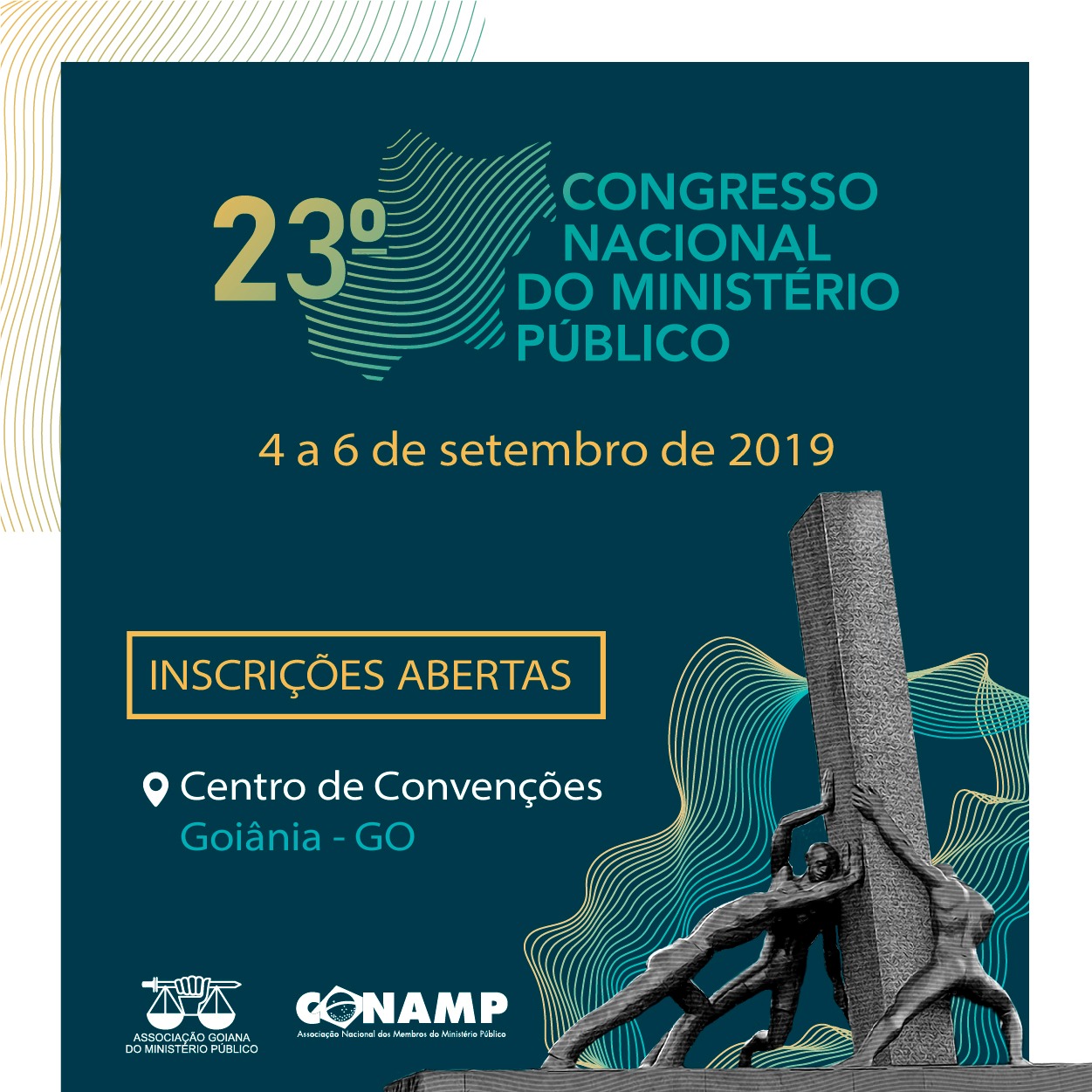 O 23º Congresso Nacional do Ministério Público, realizado pela Associação Nacional dos Membros do Ministério Público (CONAMP) e pela Associação Goiana do Ministério Público (AGMP), ocorrerá nos dias 04, 05 e 06 de setembro de 2019, no Centro de Convenções de Goiânia-GO. As inscrições já estão abertas e os associados que se inscreverem até o dia 30 de abril pagam valor promocional e ganham cortesia para 01 acompanhante. Clique aqui para fazer a sua inscrição.