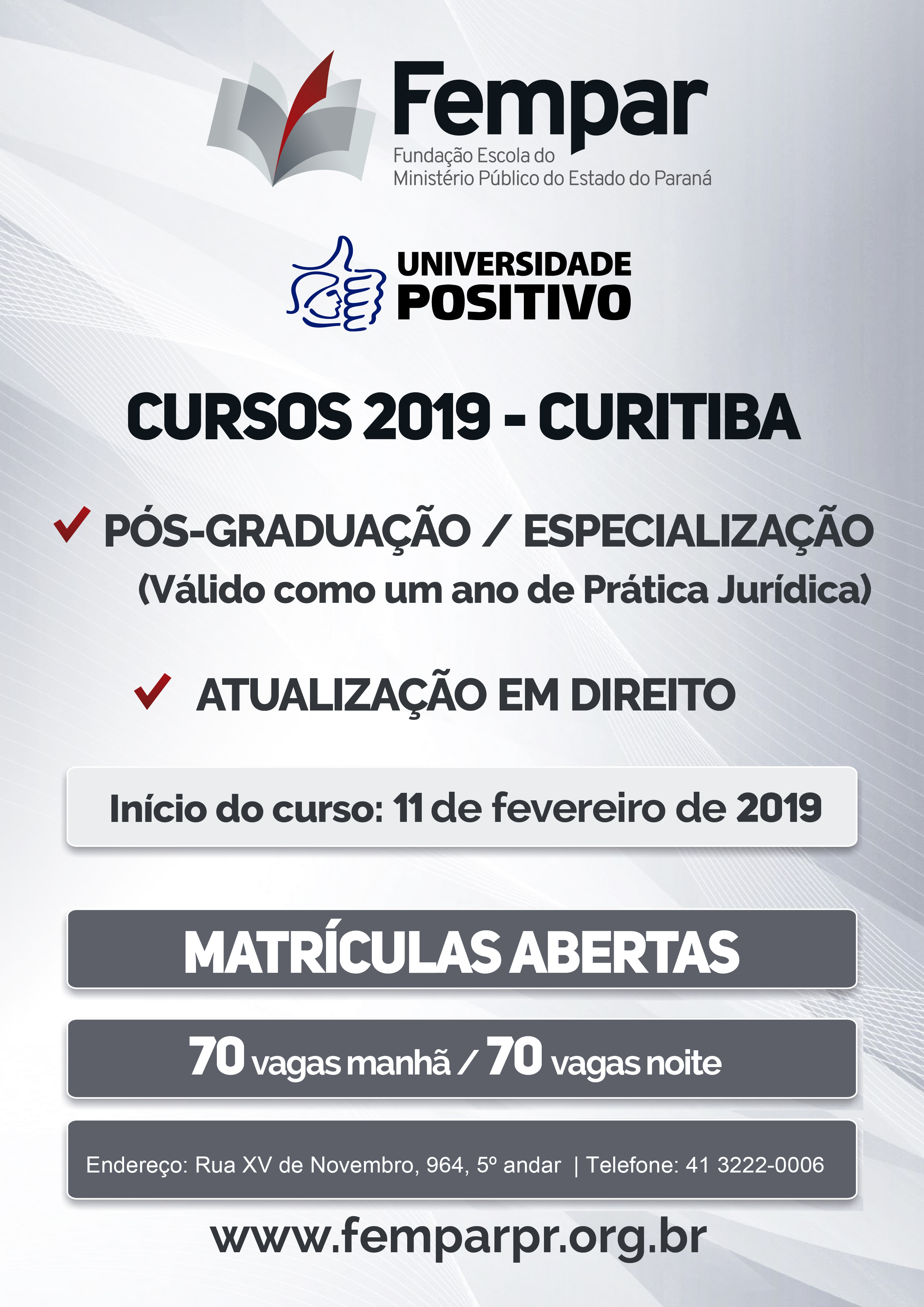 A FEMPAR oferece a servidores públicos, ex-alunos FEMPAR, associados aos Centros Acadêmicos da PUC, UNIBRASIL, POSITIVO, UEPG,UNIDOMBOSCO, estagiários, ex-estagiários do TRIBUNAL DE JUSTIÇA e do MINISTÉRIO PÚBLICO descontos de até 15% nas mensalidades dos cursos de Pós-graduação/Especialização em Ministério Público - Estado Democrático de Direito, e Atualização em Direito. Os cursos são realizados pela FEMPAR, em parceria com a Universidade Positivo (UP).