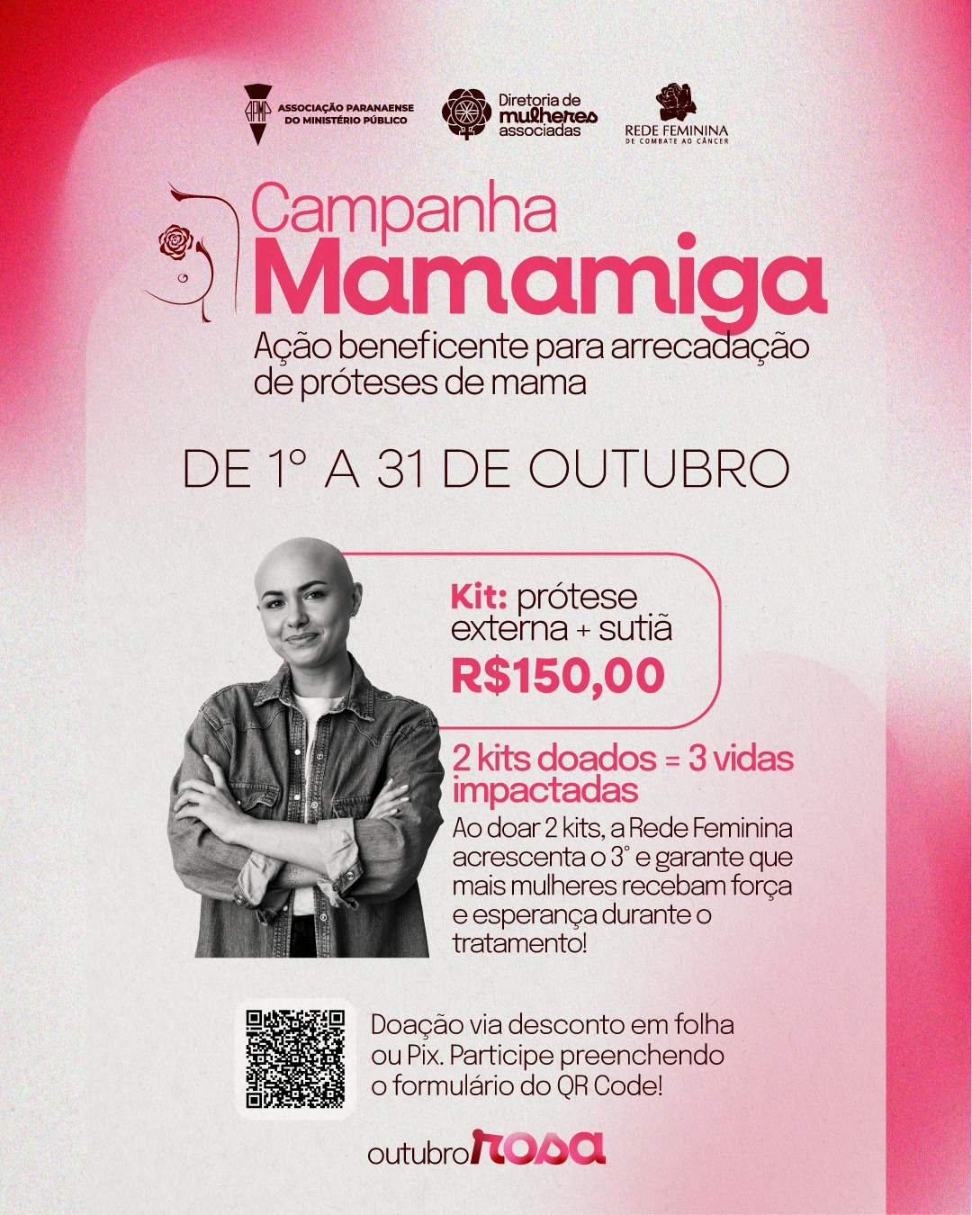 Como parte das iniciativas do mês, a Associação Paranaense do Ministério Público (APMP), por meio da Diretoria de Mulheres Associadas, realiza pelo terceiro ano consecutivo a Campanha Mamamiga, em prol de mulheres que passaram por mastectomia no tratamento do câncer de mama. A ação beneficente ocorre em parceria com a Rede Feminina de Combate ao Câncer, entidade sem fins lucrativos vinculada ao Complexo de Saúde Erasto Gaertner.
