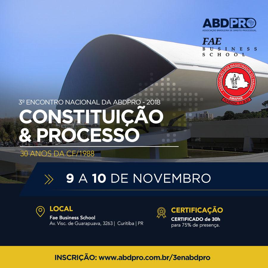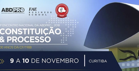 Nos dias 09 e 10 de novembro, Curitiba receberá o 3º Encontro Nacional da Associação Brasileira de Direito Processual (ABDPRO) 2018 - Constituição & Processo 30 anos da Constituição Federal – 1988. O evento é uma promoção conjunta da ABDPRO, da Associação dos Magistrados do Paraná (Amapar) e da FAE Business School.