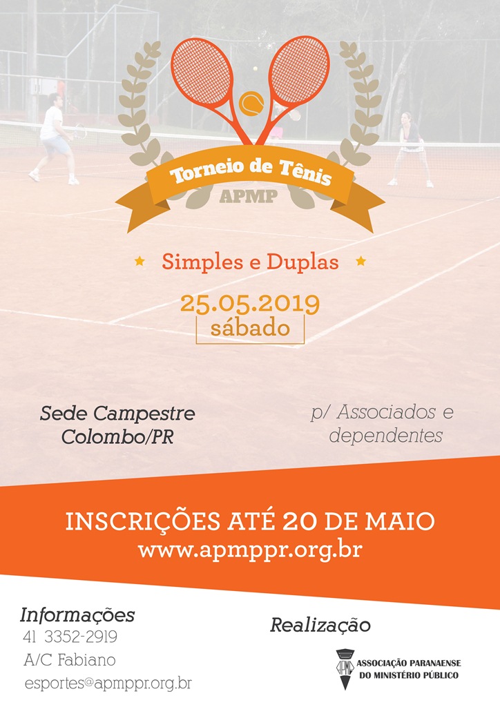 A Associação promoverá mais uma edição do Torneio de Tênis APMP. A competição ocorrerá no dia 25 de maio de 2019, com início às 9h, na chácara da APMP, em Colombo, localizada na Rua Presidente Faria, n°4701.